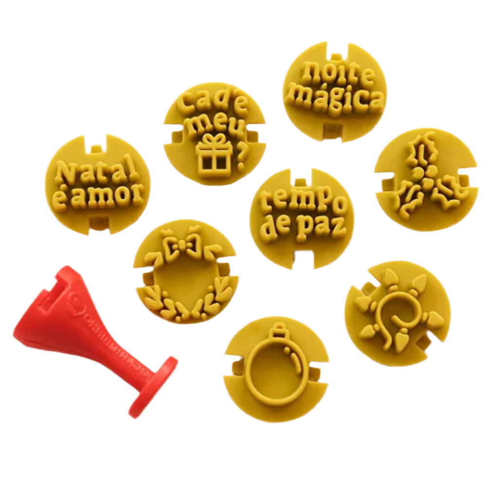 O Kit Carimbos para Brigadeiros Natal 2 é composto por 9 (nove) peças, sendo 1 (uma) base de fixação e as cabeças para marcação com as figuras pisca pisca, guirlanda, bola de natal, visco de natal e as frases cadê meu presente, noite mágica, natal é amor e tempo de paz. Com ele você fará marcações diretamente no brigadeiro a ser decorado.