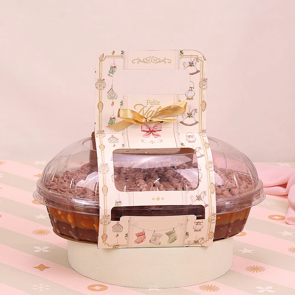 A parte inferior da cinta é decorada com uma ilustração de presentes, doces e enfeites de Natal.