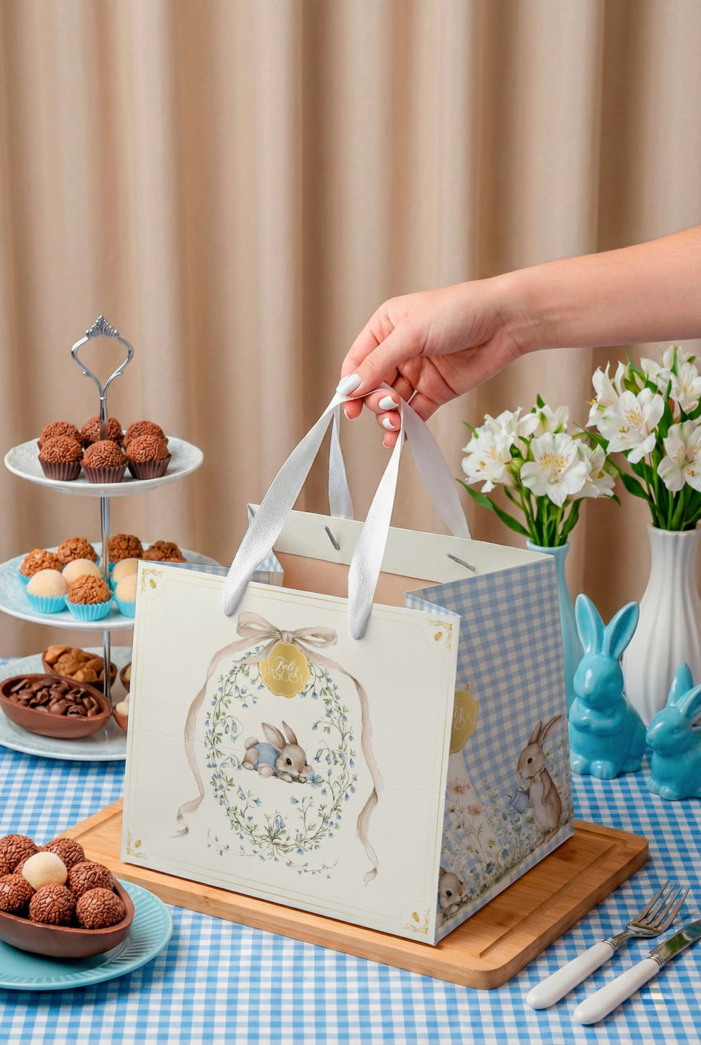 A Sacola Quadrada da linha Carinho é a solução definitiva para quem busca aliar amplo espaço interno a uma apresentação impecável e sofisticada. Com um formato diferenciado, que acomoda perfeitamente caixas maiores e itens volumosos, ela ostenta uma ilustração clássica de coelho emoldurada por guirlandas florais, transmitindo uma mensagem imediata de afeto e elegância. O fundo em padrão xadrez azul traz um charme atemporal, garantindo que o seu produto seja entregue com o máximo de requinte e segurança, elevando a experiência do cliente desde o primeiro olhar.